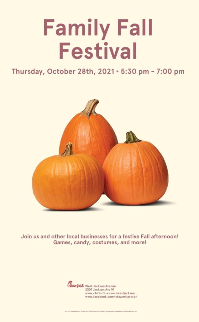 - October 28, 5:30-7 PM – Fall Festival at Chick-fil-A and surrounding businesses