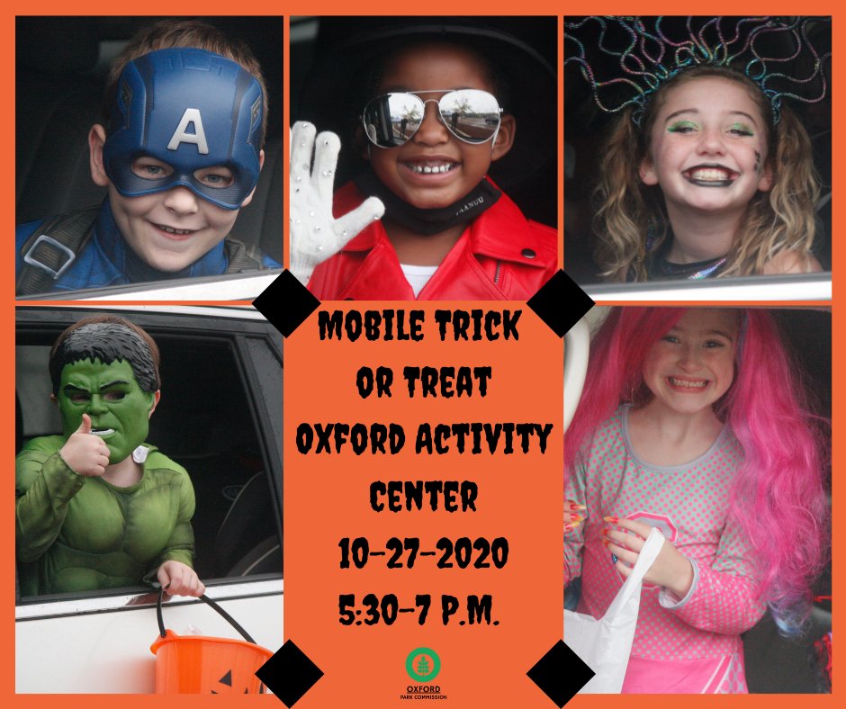 The Oxford Activity Center will hold a Mobile Trick or Treat event from 5:30 to 7 p.m. tonight. Drive through and get some goodies. Costumes are encouraged.