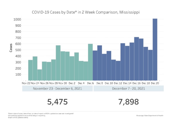 Just a few days after Christmas, the MSDH announced a sharp increase in new cases, hospitalizations and outbreaks. The omicron variant now accounts for 13 percent of COVID-19 cases in the state, the health department. From Dec. 21-27, Mississippi saw an 80 percent jump in new cases and 161 more hospitalizations when compared to the previous week, MSDH said.