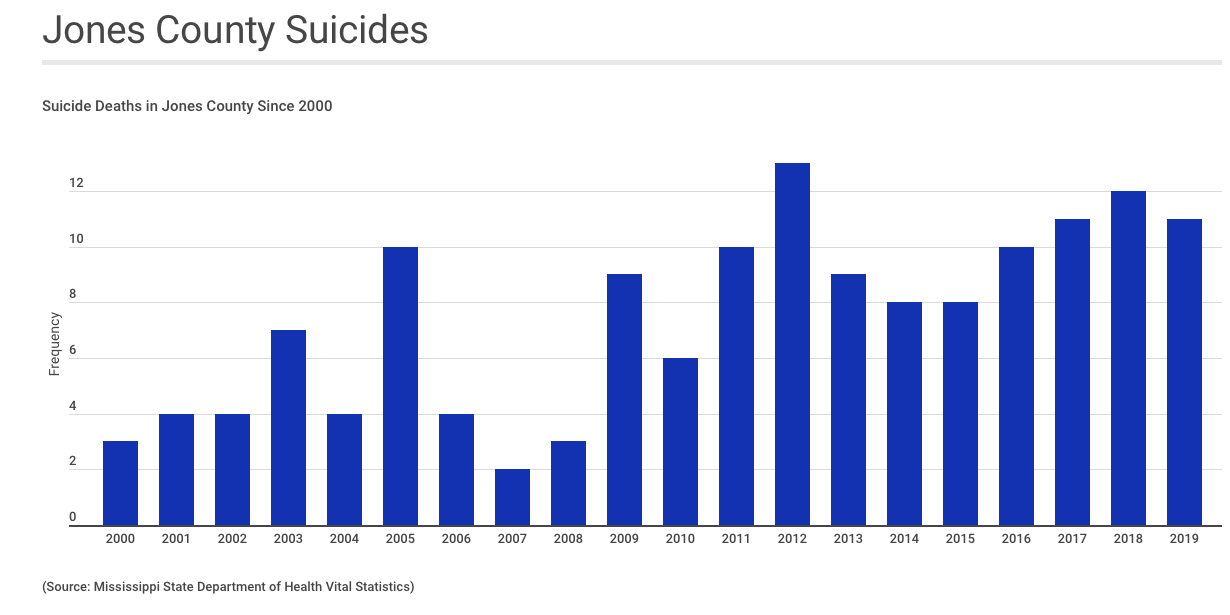 Suicides in Jones County have nearly doubled from an average of 5.0 suicides in the decade from 2000 to 2009 to an average of 9.9 suicides in the decade from 2010 to 2019 as reported in the Mississippi State Health Department Vital Records.