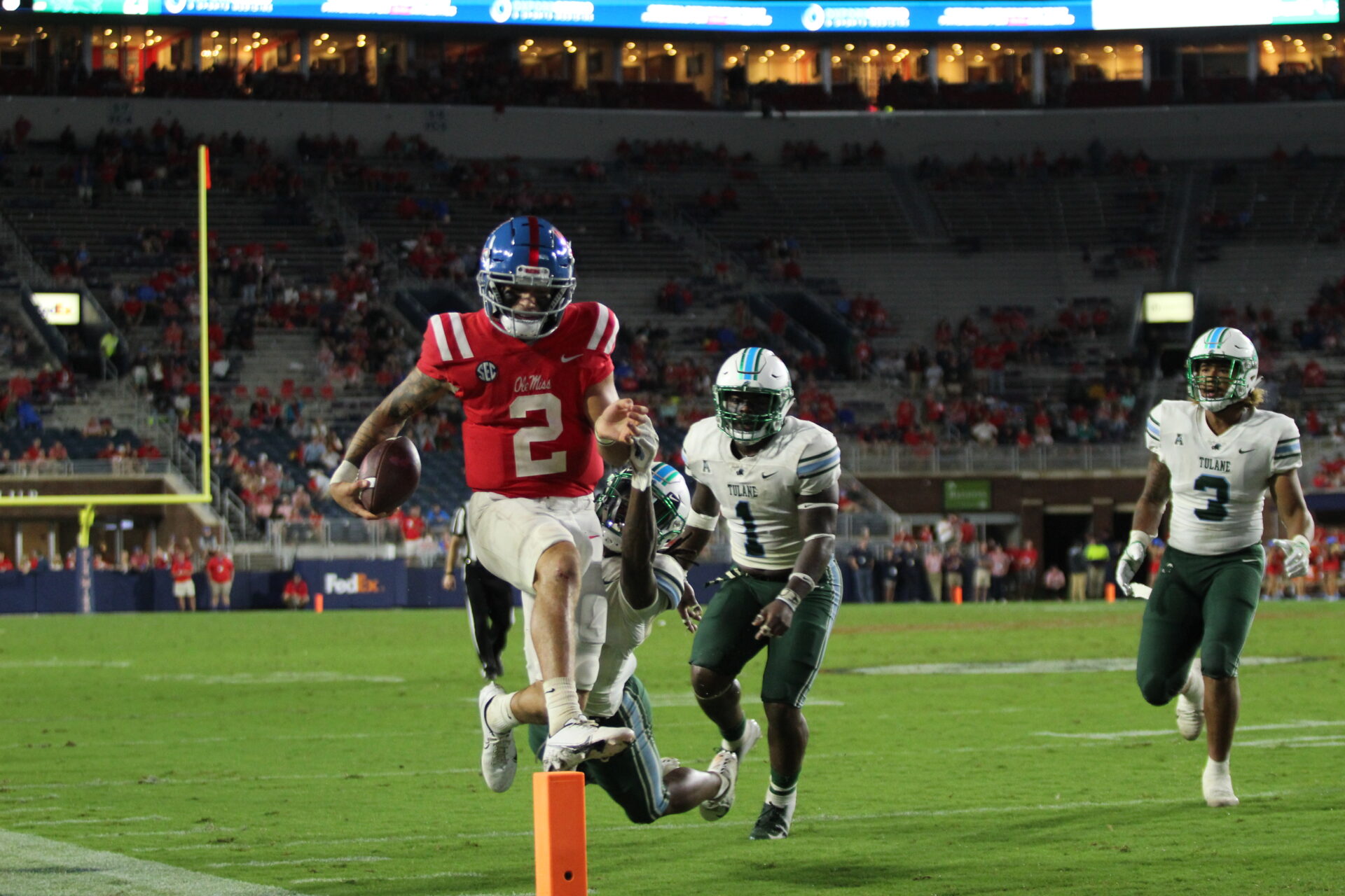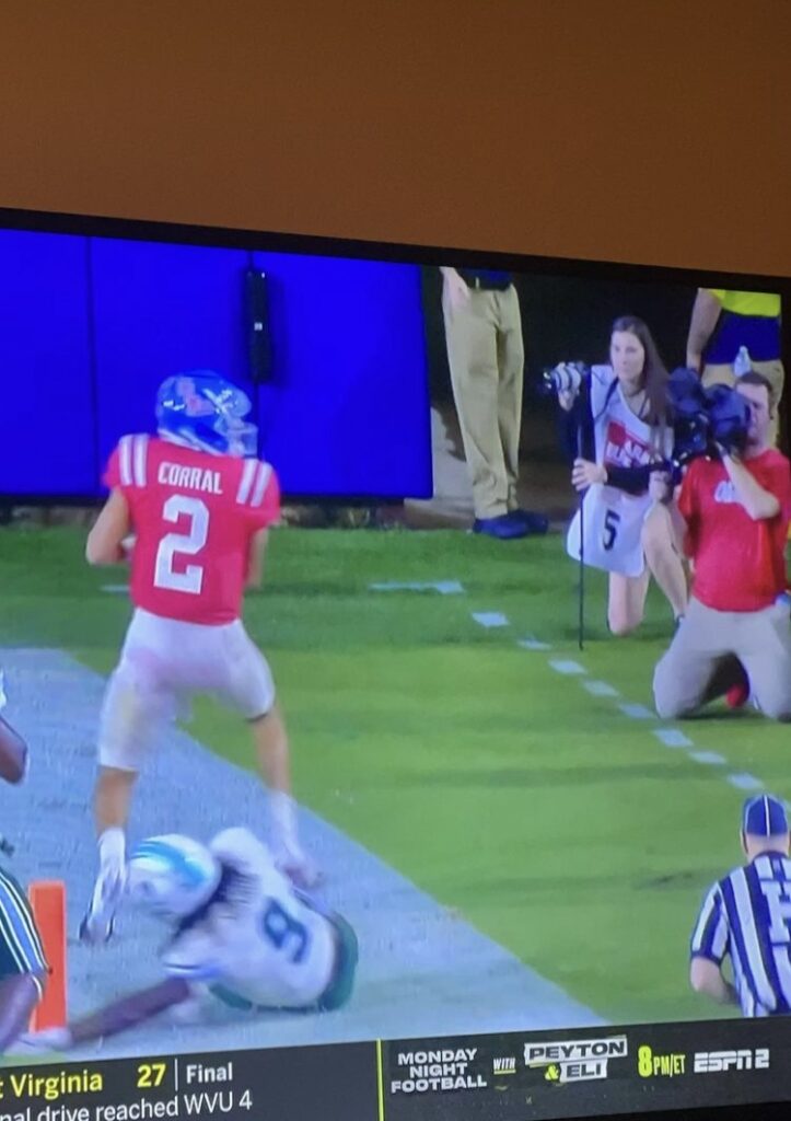 One of my favorite pictures came from the Ole Miss vs. Tulane game. I did not go on the field for the first half because the game had a long delay and the field was almost ready to swim in. I didn’t want my equipment to get wet, and I had to be on camera after the game. The second half of the game I got a picture of Matt Corral jumping over a field goal pylon, and a friend sent a screenshot of my reaction because I saw how close Matt was getting to me. I have a couple more favorite shots from the season that I may share later, too.