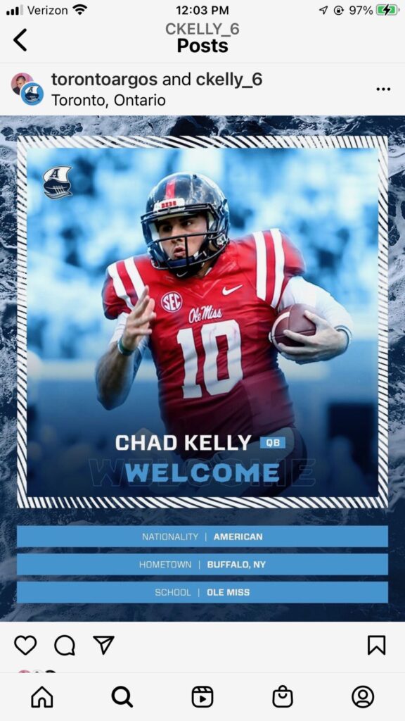 Former Ole Miss quarterback Chad Kelly signed with the Toronto Argonauts of the Canadian Football League on Thursday.