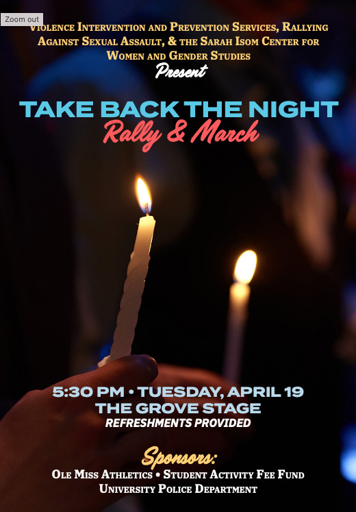 Take Back the Night will be held at 5:30 p.m. in the Grove on the University of Mississippi campus.