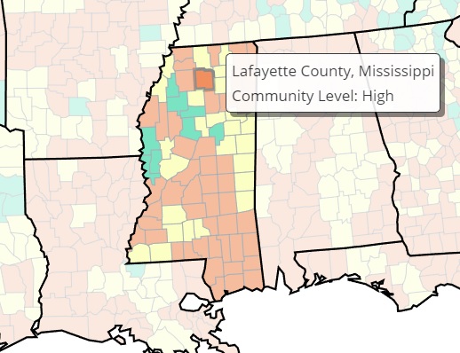 Lafayette County has been upgraded to a “High Level” of COVID-19 transmission, according to the Center for Disease Control.