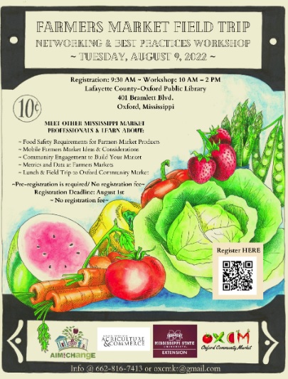 The event will start with networking and workshop activities at the Lafayette County Oxford Public Library. Participants will then take a โ€œfield tripโ€ to visit the Oxford Community Market, which is located near the library at the Old Armory Pavilion where it has operated since 2015 and serves farmers and local food enthusiasts every Tuesday year-round from 3-6:30 p.m.