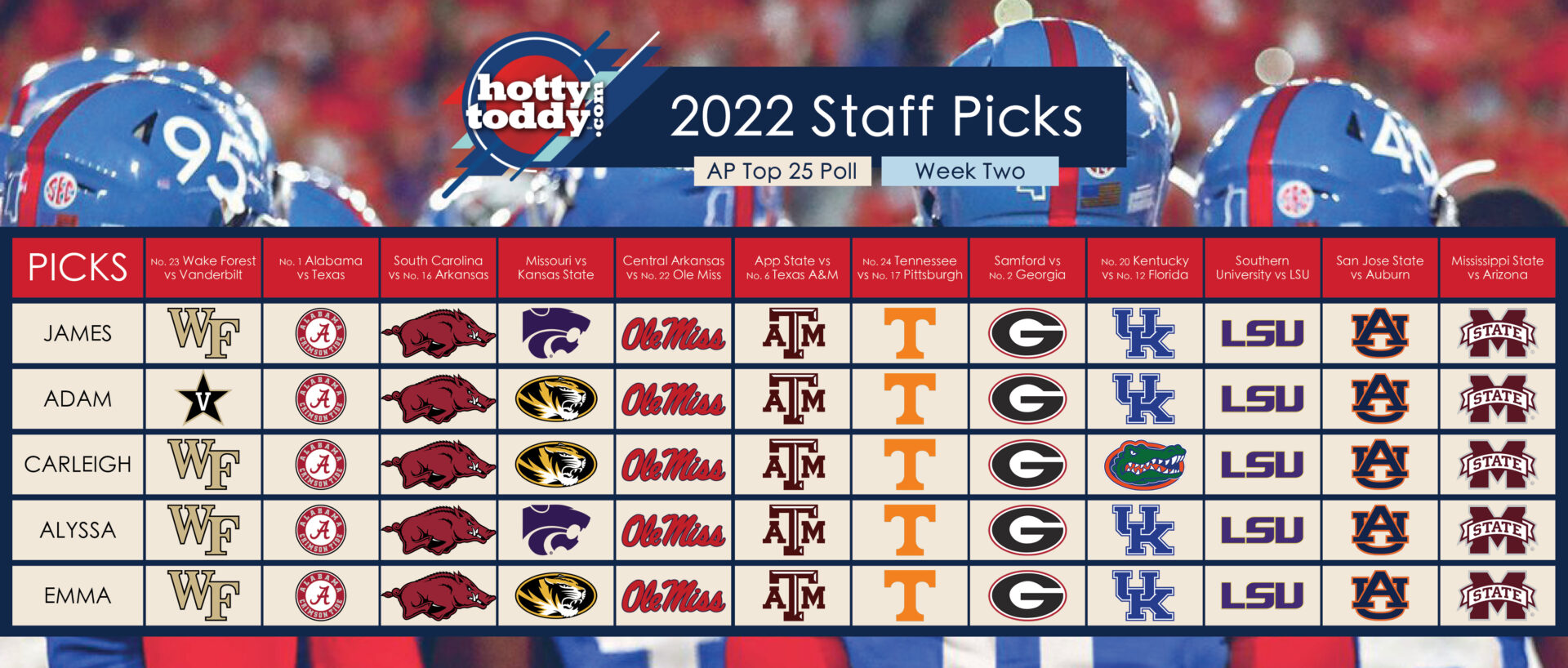 HottyToddy.com’s staff is back with their weekly picks from a handful of games each week. Editor James Dowd, News Editor Alyssa Schnugg, Sports Editor Adam Brown, Graduate Assistant Carleigh Holt and student contributor Emma Averett will each give picks.