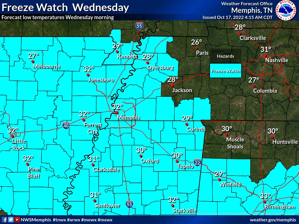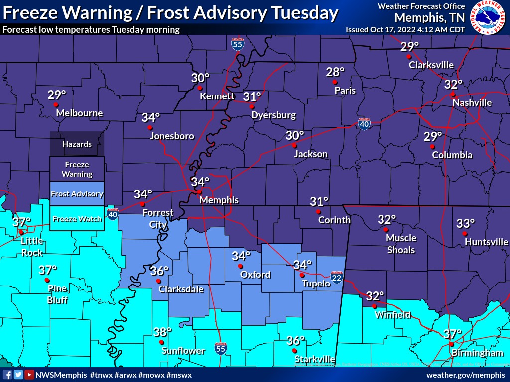 The high is expected to hit 51 degrees on Tuesday but then drop to as low as 28 degrees, prompting the NWS to issue a Frost Watch late Tuesday night through Wednesday morning.