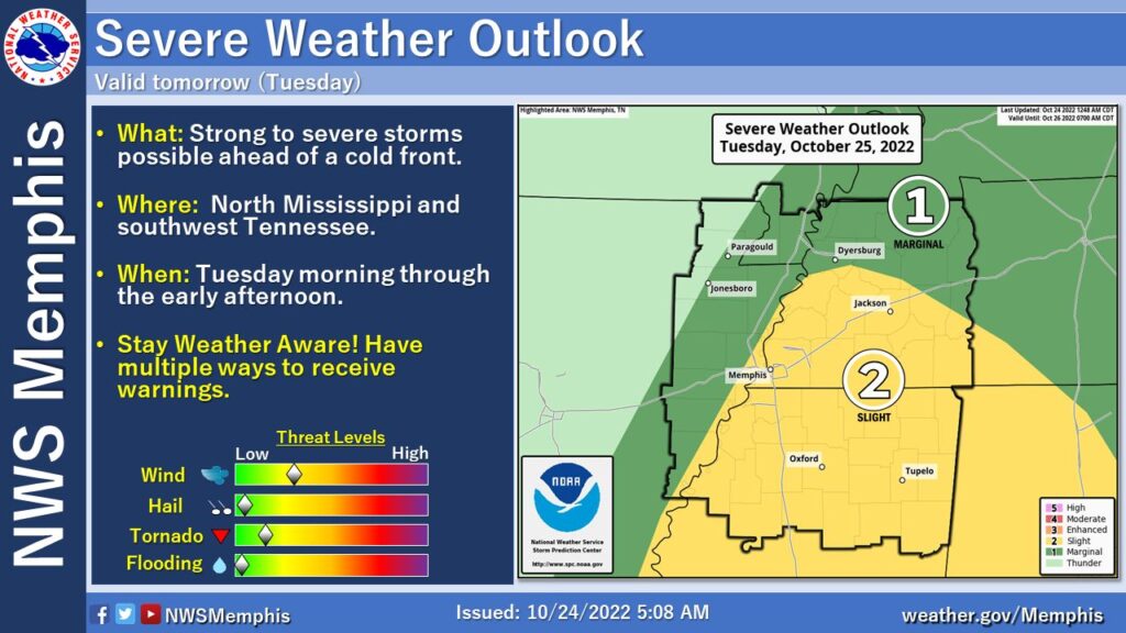 According to a post on the NWS-Memphis Facebook Monday morning, there are two possible scenarios for Tuesday as an organized line of thunderstorms develops ahead of the cold front.
