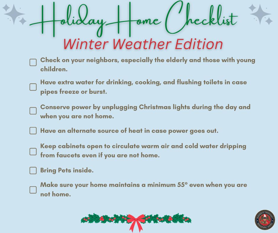 “Remember never to use your stove or oven to heat your home. Also never run a generator in your home. Check the batteries in your smoke and carbon monoxide detectors and make sure they are working. If you have outdoor pets bring them inside if possible. If itโs not possible make sure they have plenty of food and water and are not overly exposed to extreme cold.โ