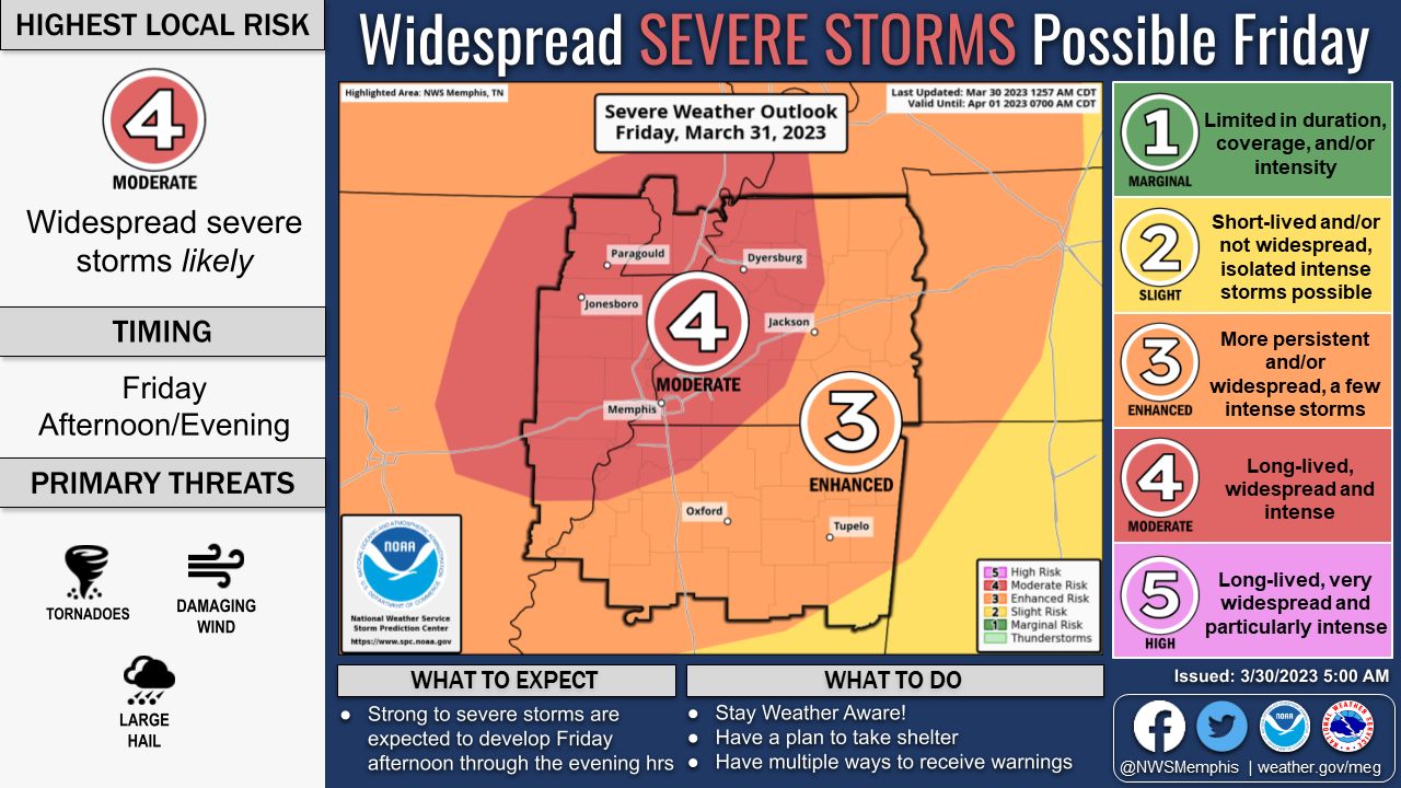 The area just north of Lafayette County is rated a 4, or Moderate Risk for severe weather. As conditions could change, the NWS urges residents under the Enhanced Risk to stay tuned for updates and remain โweather aware.โ