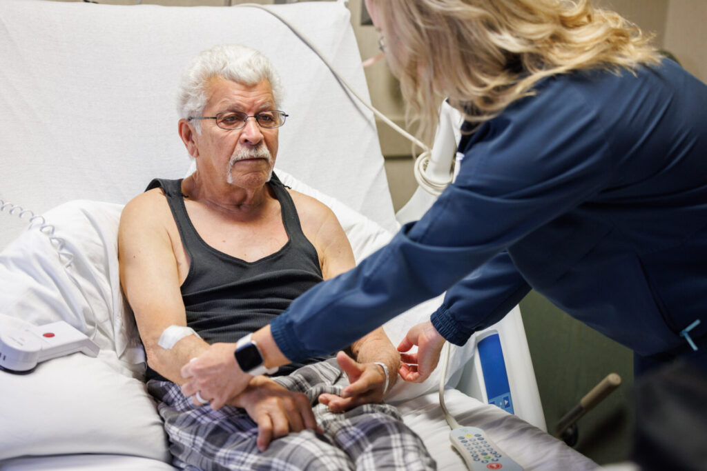 Then, Huang asked Bustin to get out of bed. Pressly stood near, ready to assist if Bustin needed help. “Take your time,” she told her patient.