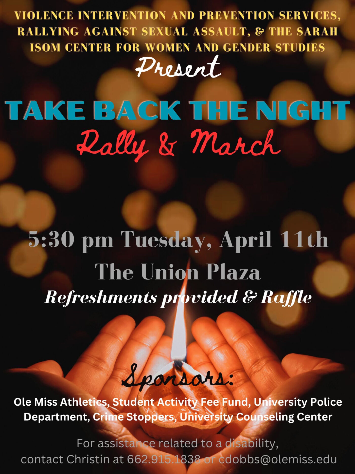 Members of the University of Mississippi community will gather Tuesday (April 11) on the Ole Miss Student Union Plaza to “Take Back the Night” during Sexual Assault Awareness Month.