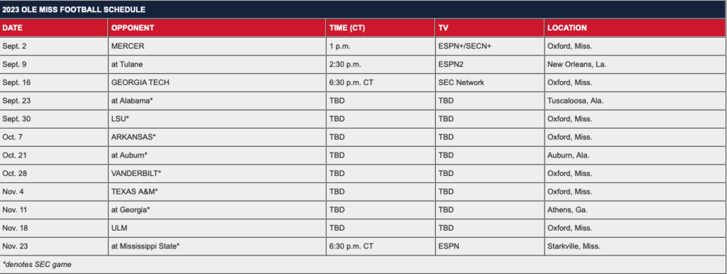 Kickoff times and TV assignments for 2023 Ole Miss football games against Mercer, Tulane and Georgia Tech were announced Wednesday by the Southeastern Conference and ESPN.