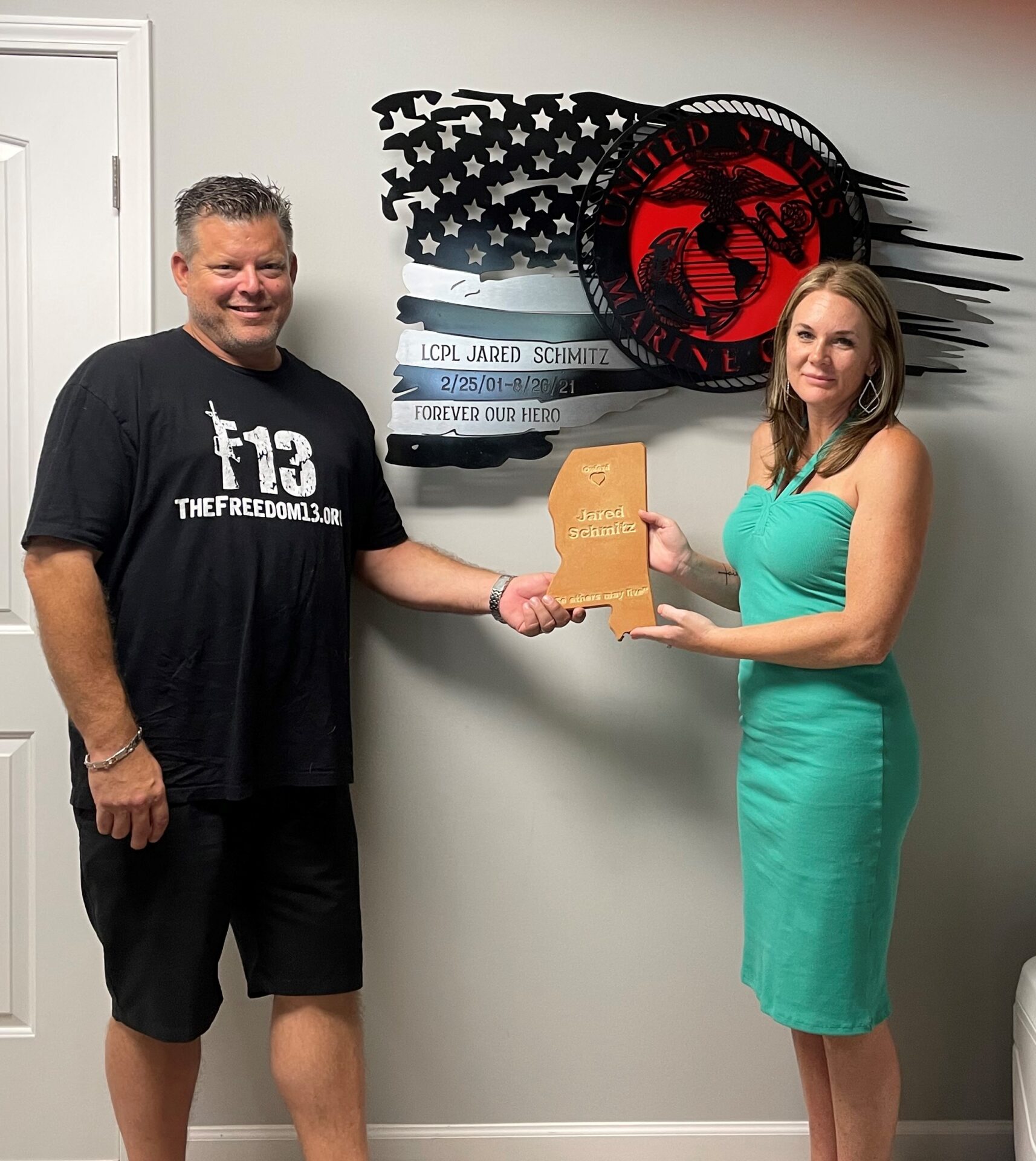 In early 2022, with the help of his friend, Harry Sneed, Corban created a wooden plaque in the shape of Mississippi. On it, he carved a heart with โOxfordโ on top. He then inscribed the name of each service member’s name, adding the words โSo Others May Live” across the bottom.