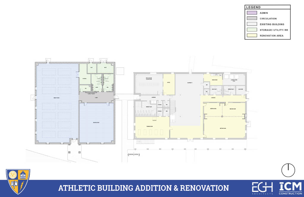 - Add single-hole restroom, replace gym floor with soft sports flooring, add curtain to the stage