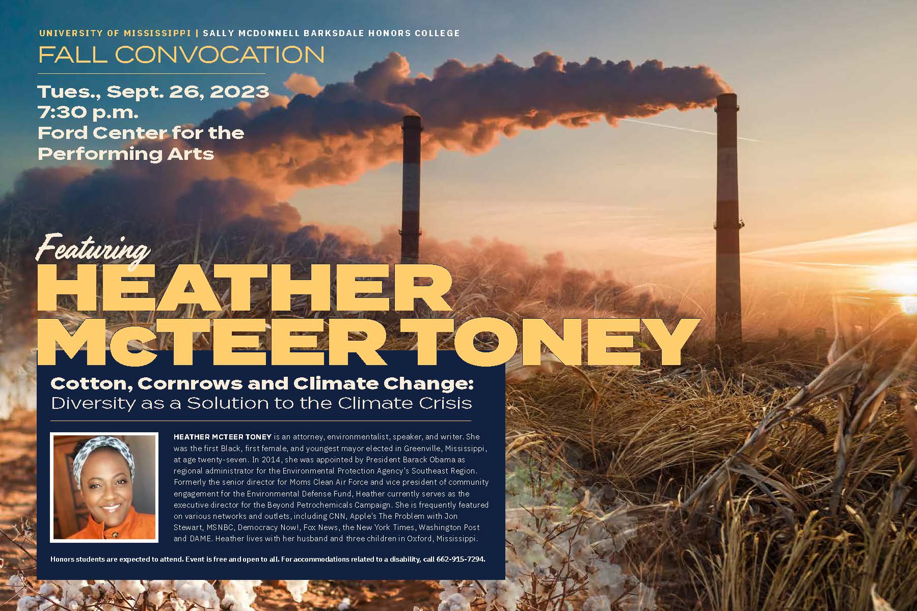 Heather McTeer Toney, an accomplished attorney and author, will deliver the keynote address for the Sally McDonnell Barksdale Honors College‘s fall Honors Convocation at the University of Mississippi.